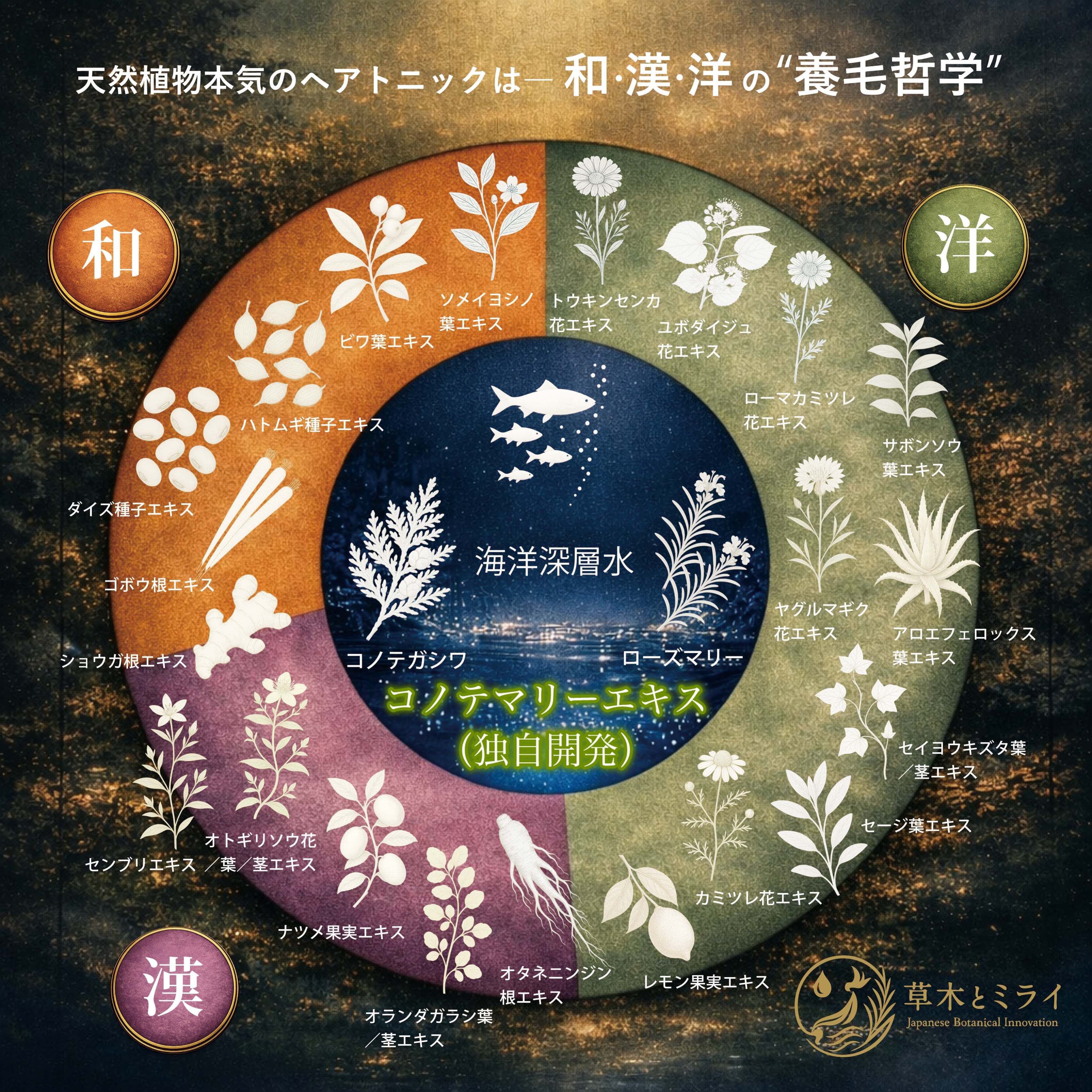 「頭循法」は、頭の生え際を一周しながら、天然植物と海洋深層水の力をめぐらせることで、頭皮、ほうれい線、お顔の印象、全身までを整える、草木とミライ独自のケア法を提唱します。